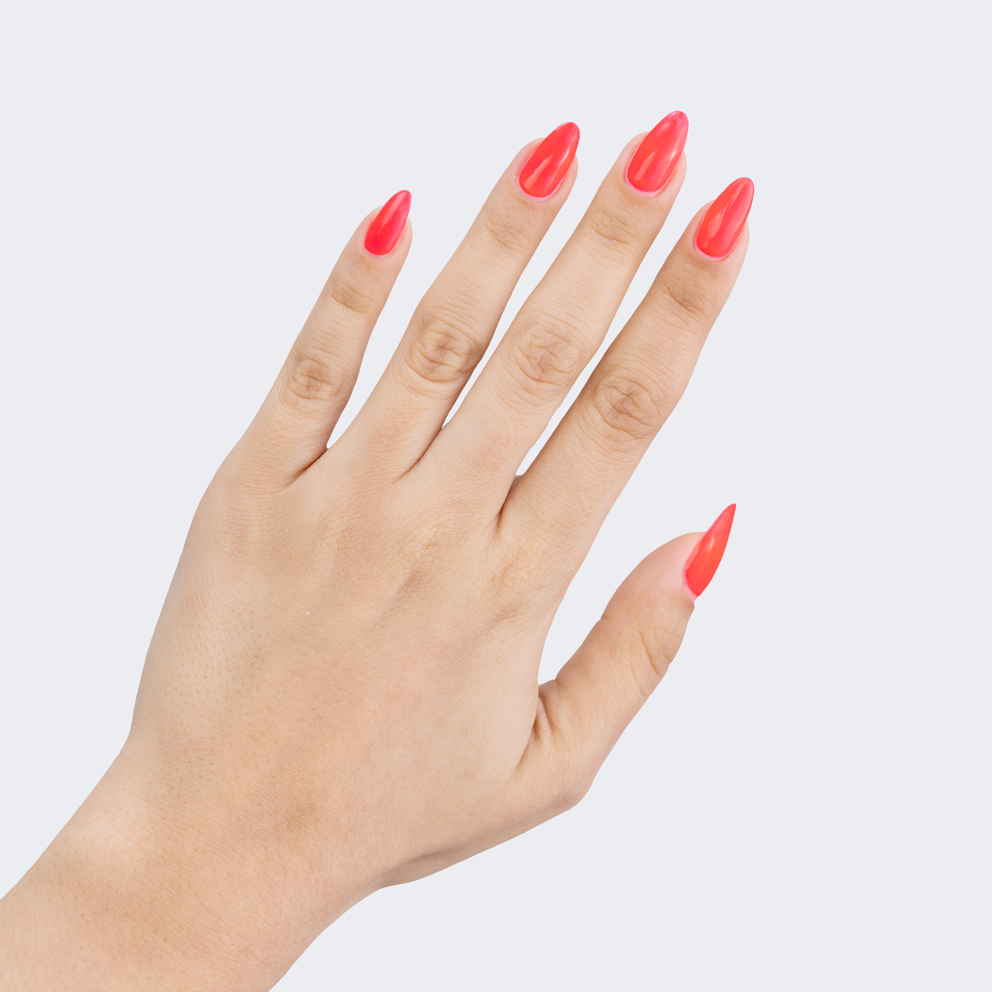Neon pink-red. Medium. Bright. Opaque. Warm undertone.